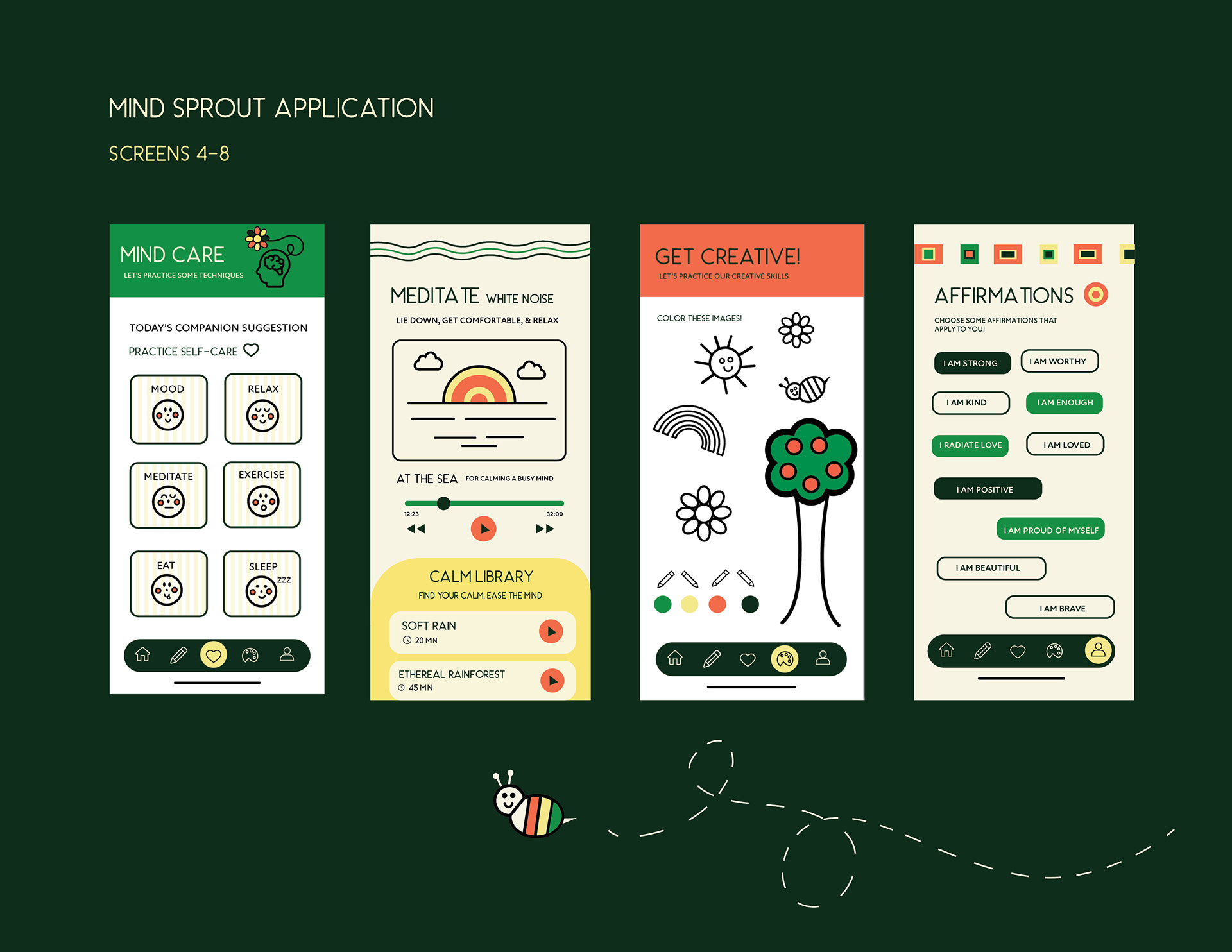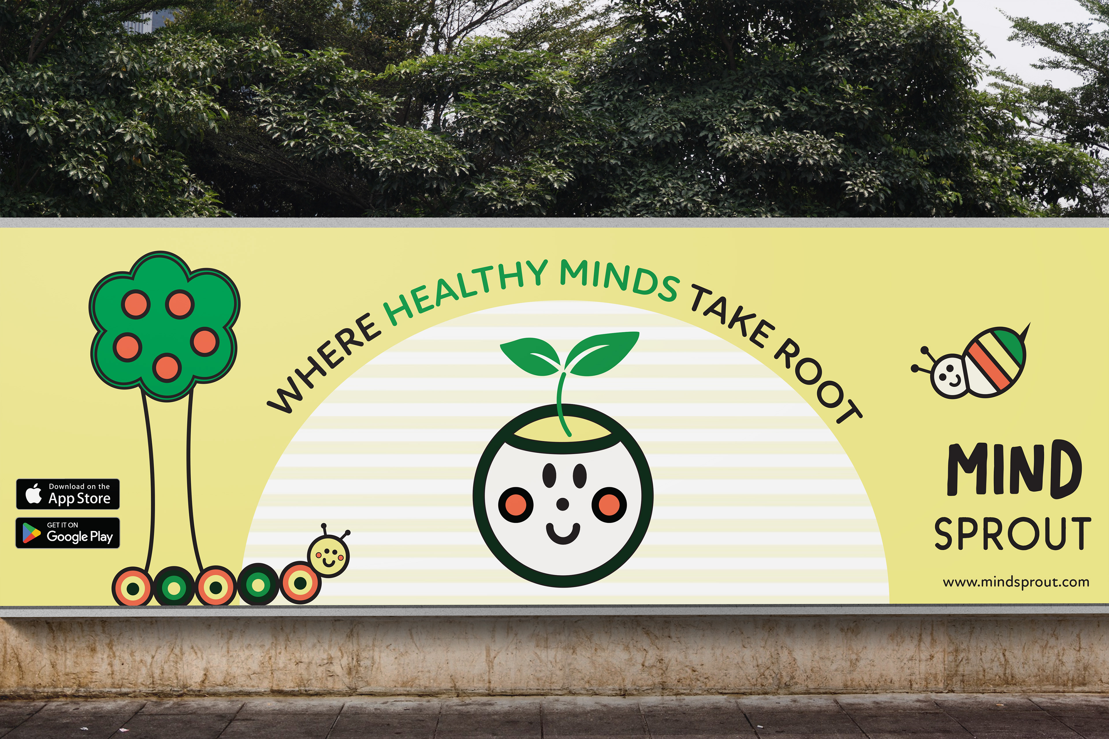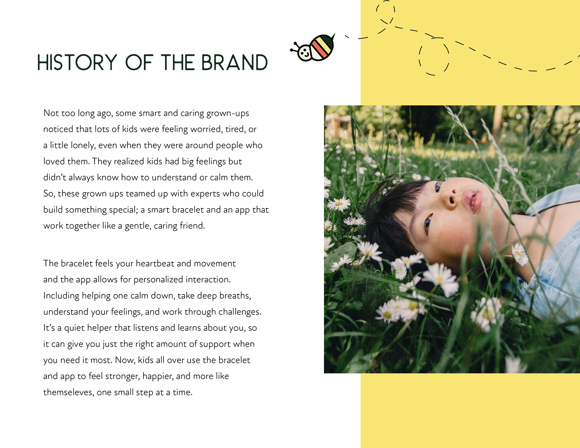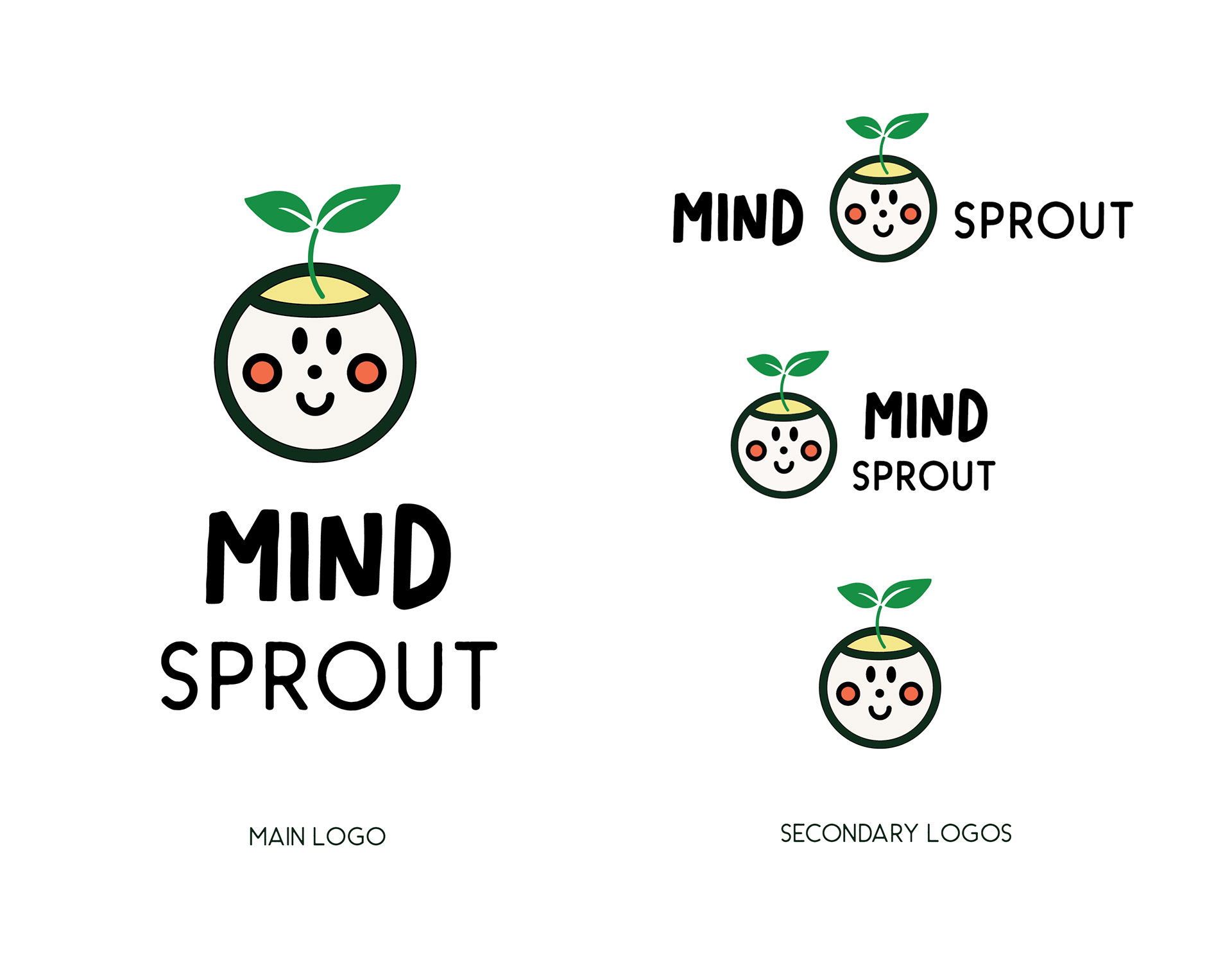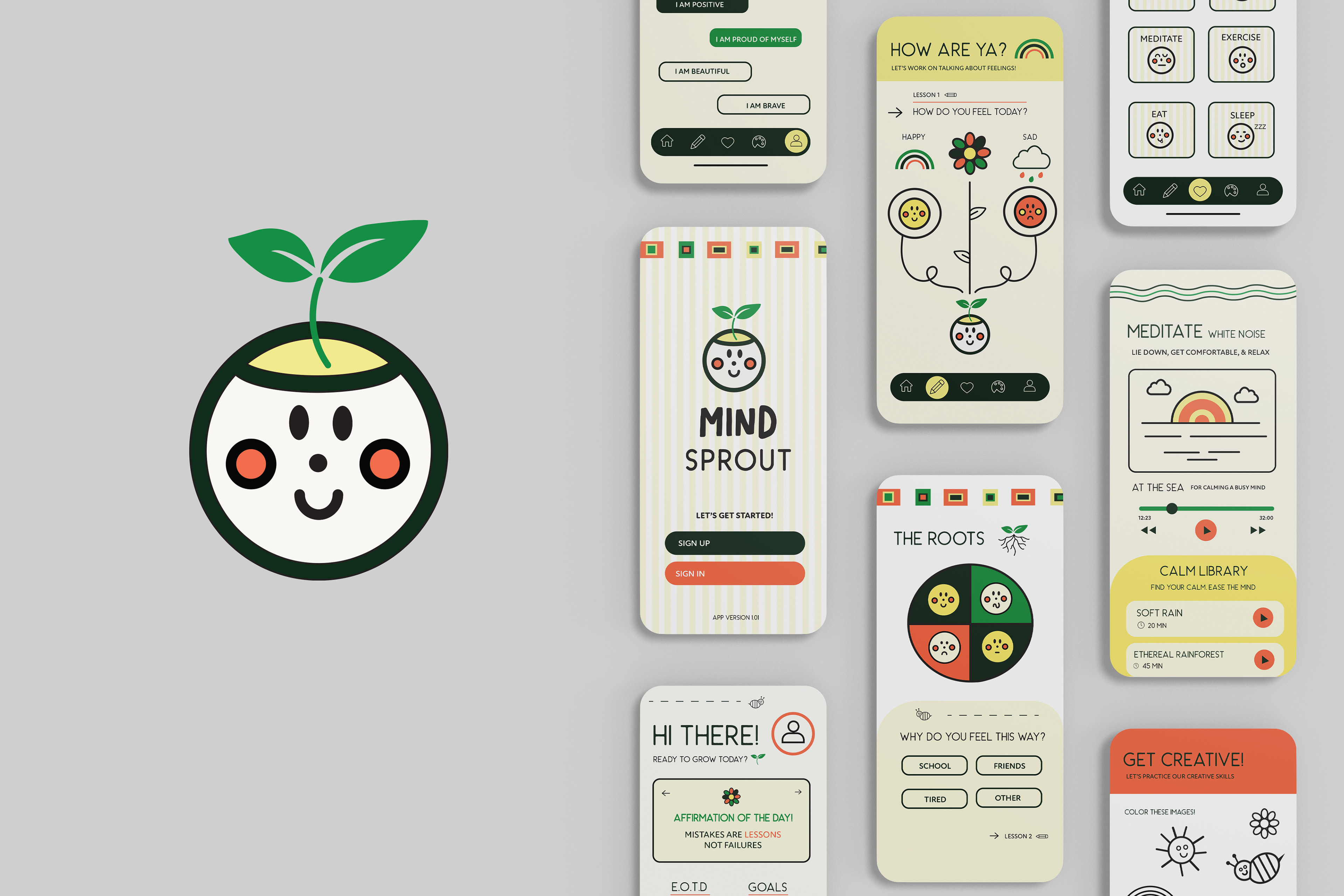 Mind Sprout embraces a playful yet grounded visual identity that blends earthy tones with vibrant pops of color, evoking both nature and joy. The aesthetic is warm, friendly, and approachable, combining childlike illustrations, soft geometric forms, and hand-drawn typography to create a sense of emotional safety and creativity. While clearly designed to appeal to children, the overall look maintains a contemporary and sophisticated feel that resonates with modern parents and educators. Mind Sprout is a modern wellness fictional "future brand" that mixes brain science, AI, and holistic healing into one simple, everyday service for young children in the form of an application and fictional wearable bracelet.