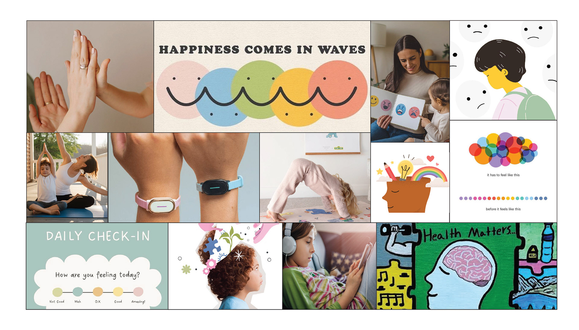These moodboards represent the company's vision which promotes emotional wellness and mindful living for children and families. The imagery emphasizes connection, self-awareness, and positivity through bright, inviting visuals, and tactile human moments. Together, these elements suggest a brand dedicated to helping kids and parents build healthy, emotional habits, celebrate daily feelings, and nurture mental well-being in an engaging, joyful way.