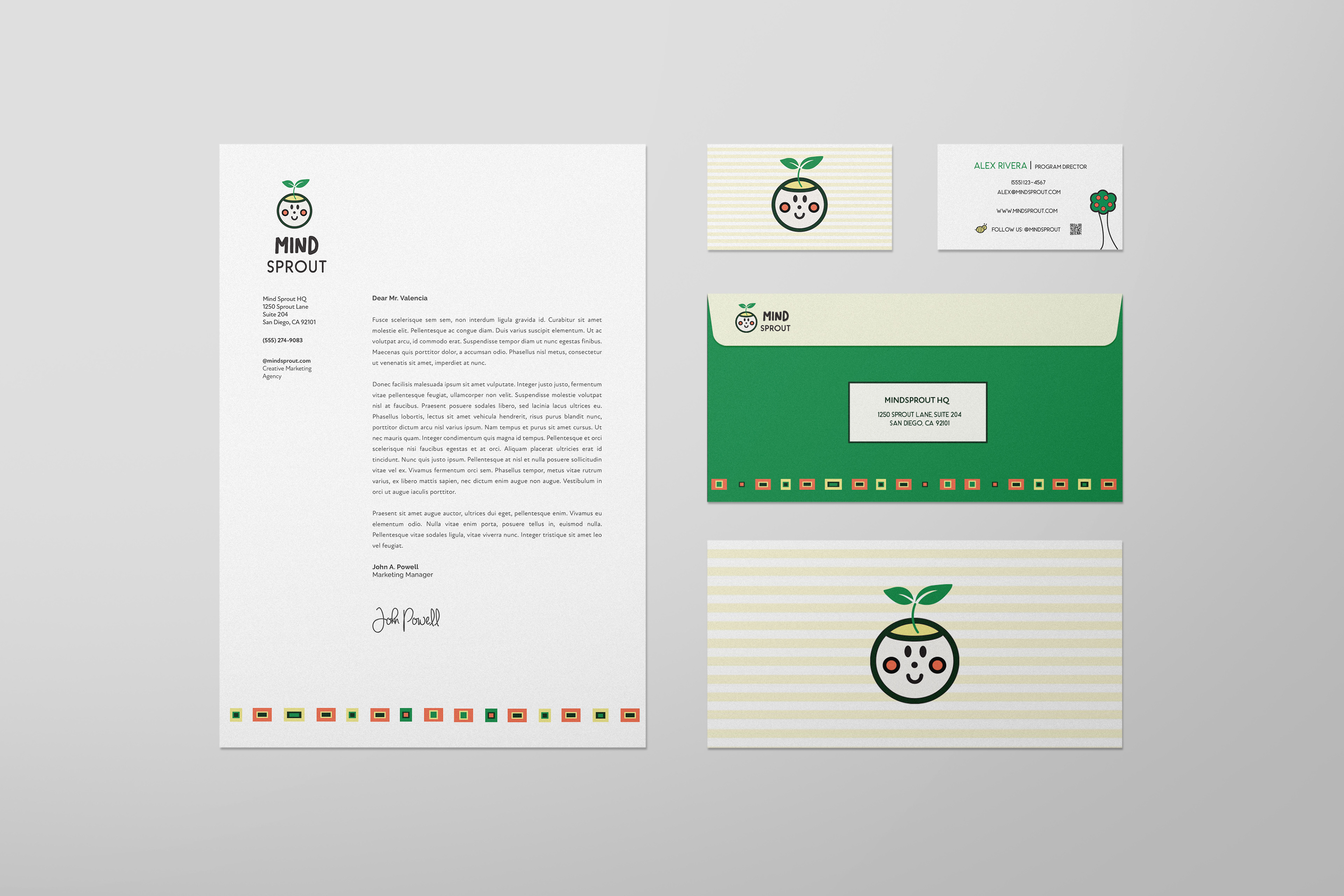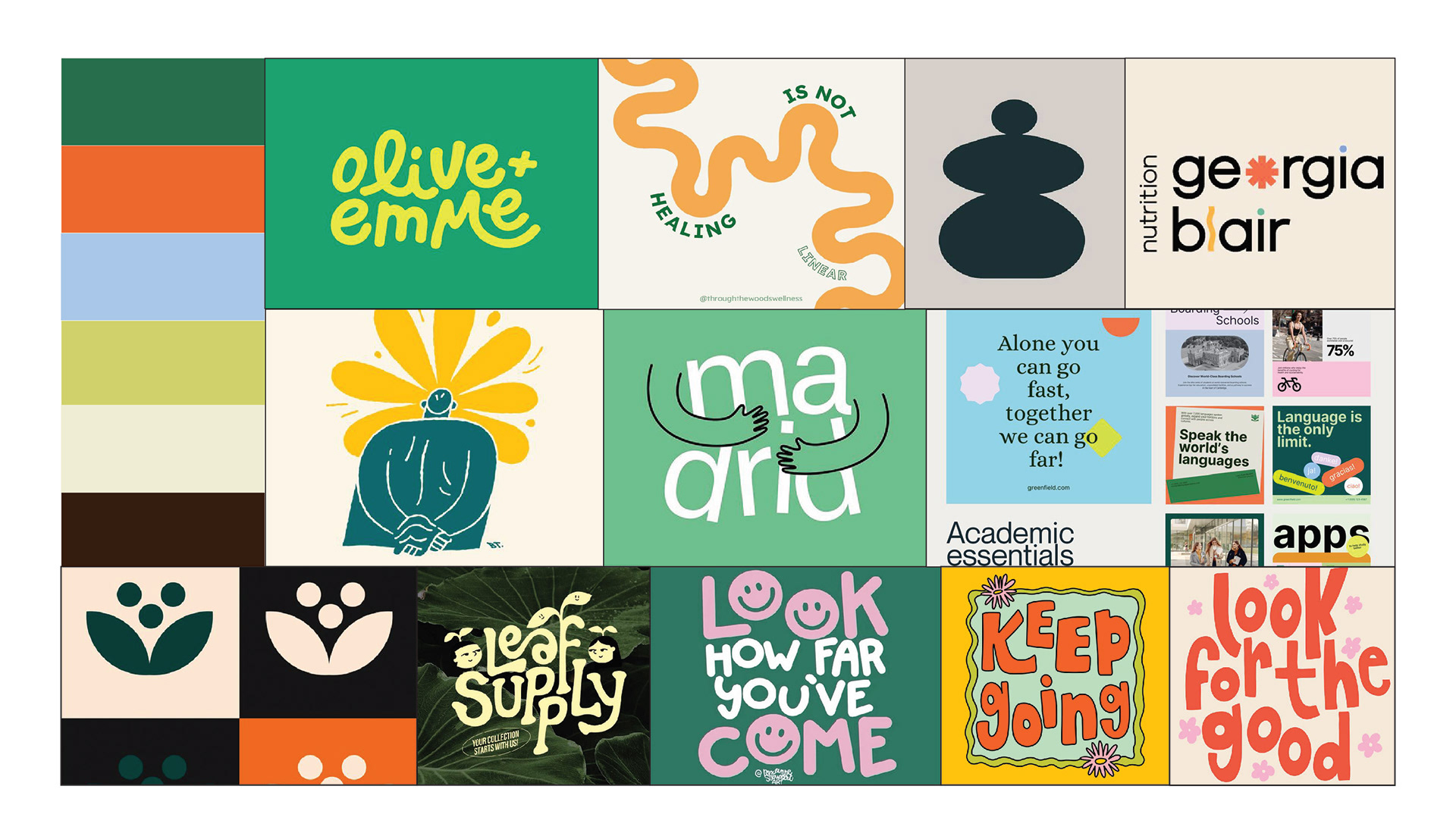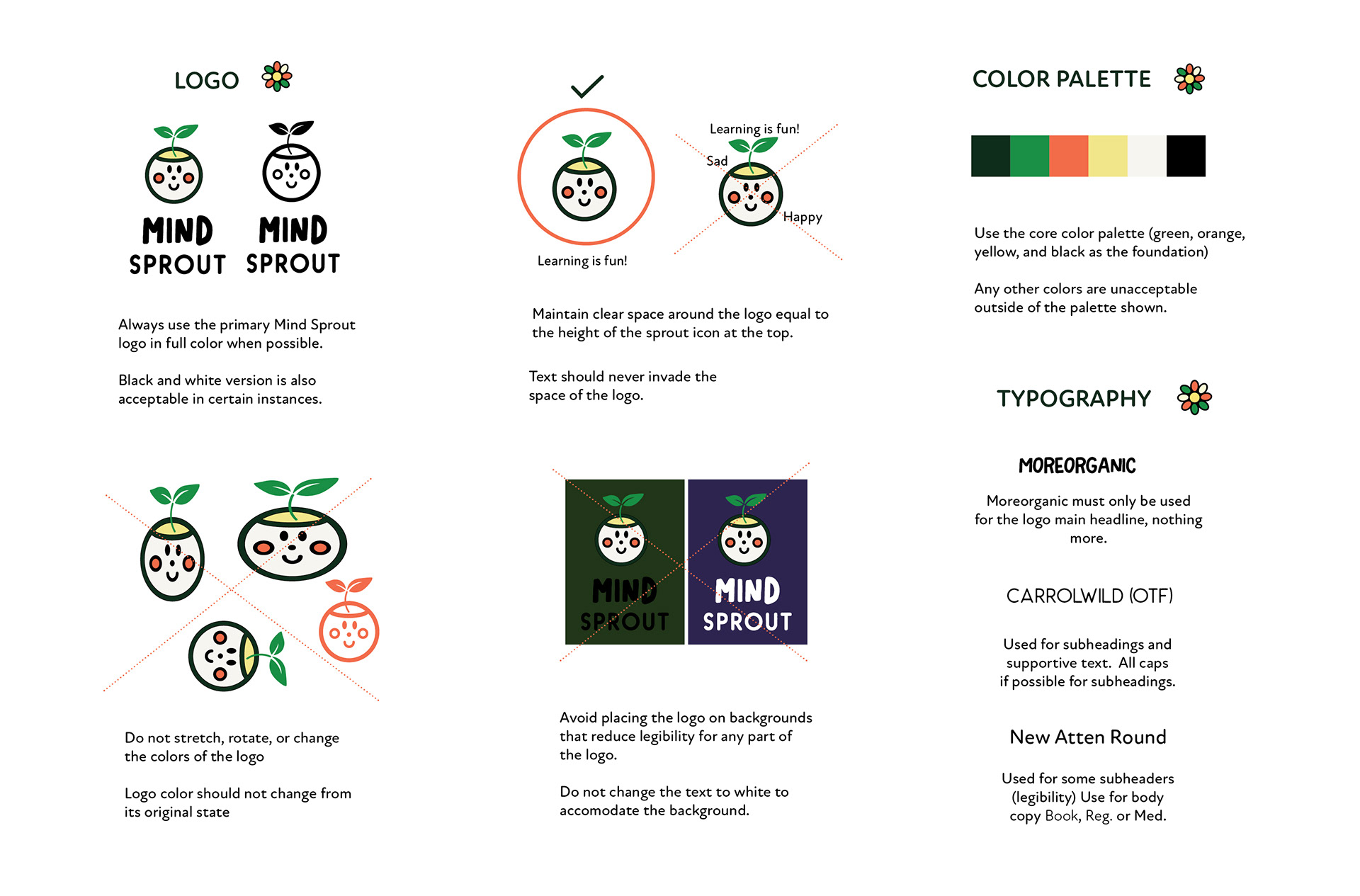 For Mind Sprout, I chose this color palette and these typefaces because they capture a contemporary childhood energy, the green is representative of growth, the orange and yellow bring a sense of creativity and playfulness, and the black keeps everything feel grounded and balanced. For the typefaces I wanted a mix that feels playful yet still clear and readable. Moreorganic has a hand drawn, natural quality that feels fun and creative. CarrolWild adds a clean but slightly whimsical touch, and New Atten Round ties it all together with structure and legibility while the rounded edges keep it soft and approachable.