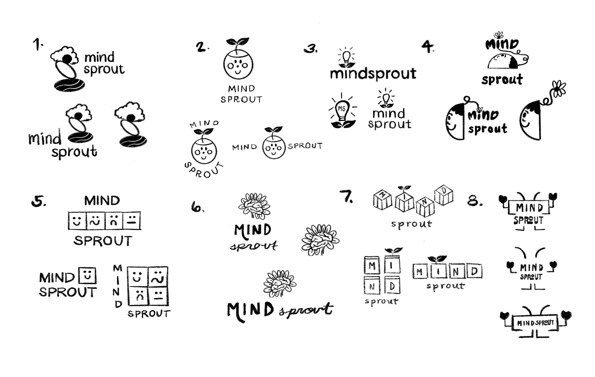 For the logo explorations, I explored different ways to express growth, playfulness, and wellness in a kid-friendly way. Some sketches focus on sprouting plants and flowers as symbols of natural growth, while others lean into character-driven designs with smiling sprouts, or seed like mascots that feel approachable and fun for kids.