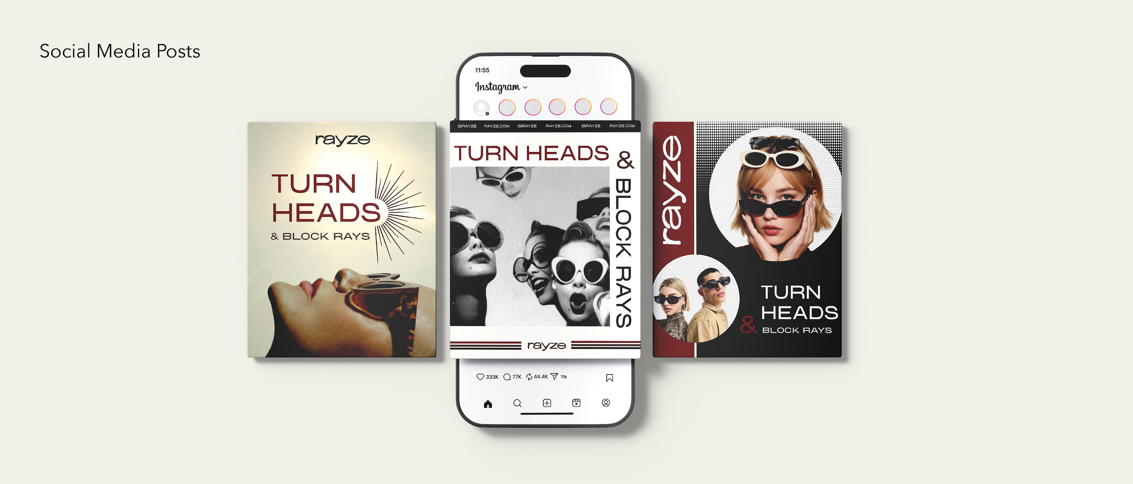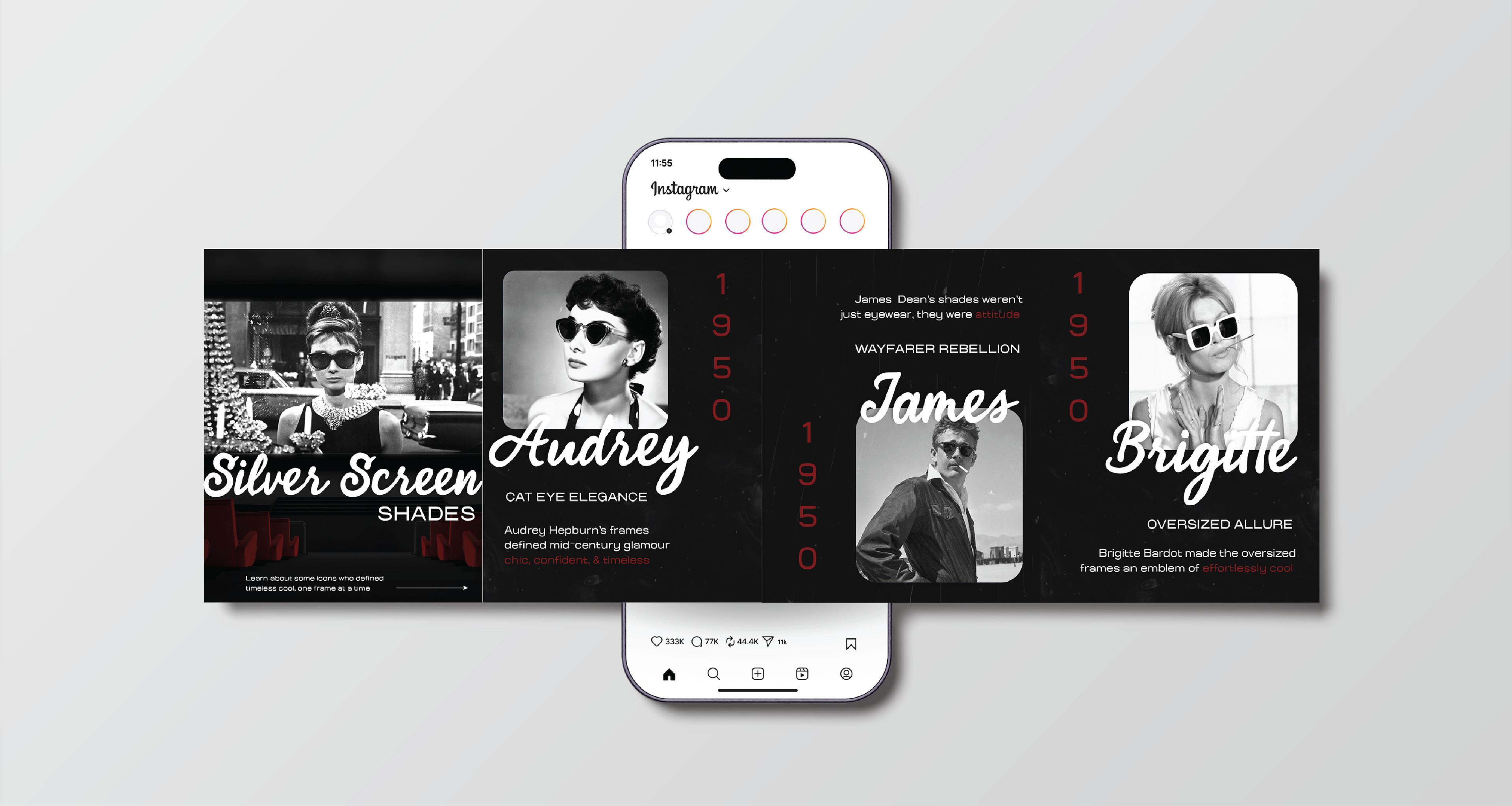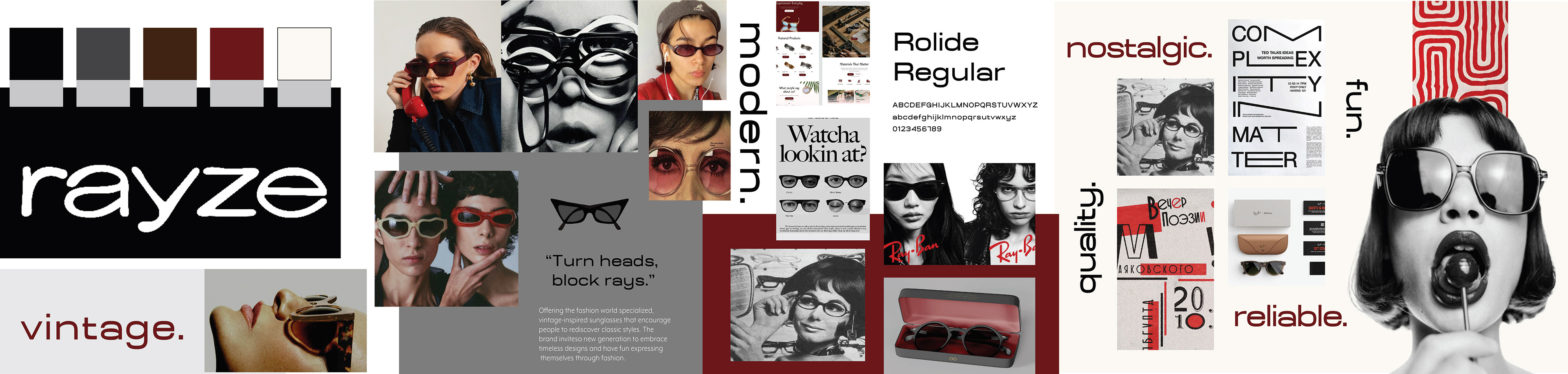 My visual research is inspired by vintage eyewear culture, editorial fashion photography, and retro graphic design, creating a visual identity that balances nostalgia with modernity. Classic sunglass silhouettes and archival advertising influence the bold imagery and expressive portraits, reinforcing the brand’s emphasis on individuality and statement-making design. A muted palette of neutrals, deep reds, and soft creams establishes a timeless, elevated tone, while clean typography keeps the brand feeling contemporary.