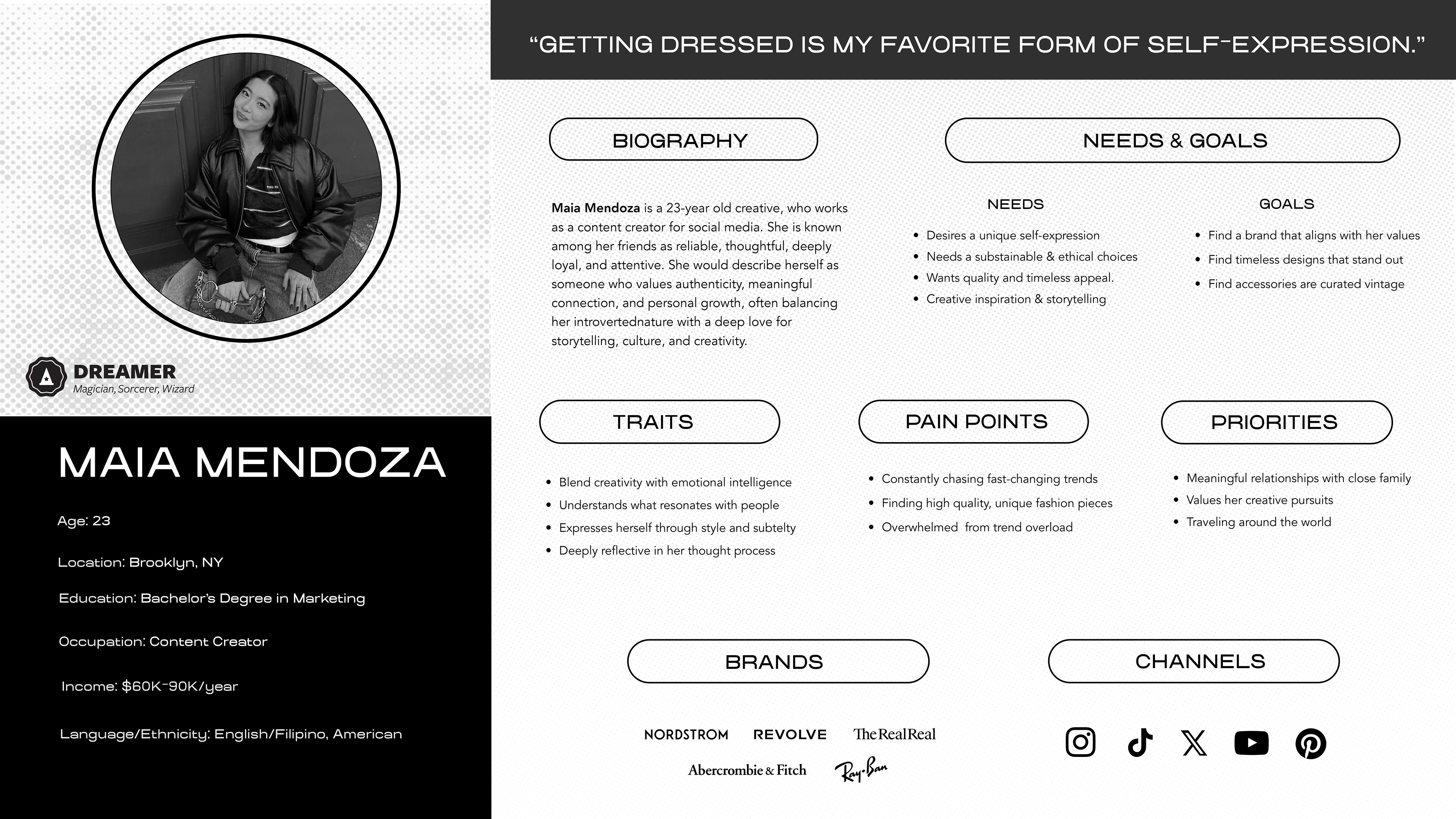 The goal of this project was to create a fashion brand. I chose to create a curated-vintage sunglass company that celebrates genuine craftsmanship and pays respect to history/craftsmanship. The purpose of the brand is to offer the fashion industry specialized vintage sunglasses that encourage people to rediscover classic styles. The brand invites a new generation to embrace timeless designs and have fun expressing themselves through fashion. The brand wants its consumers to know that vintage isn't just a look, it's a feeling.