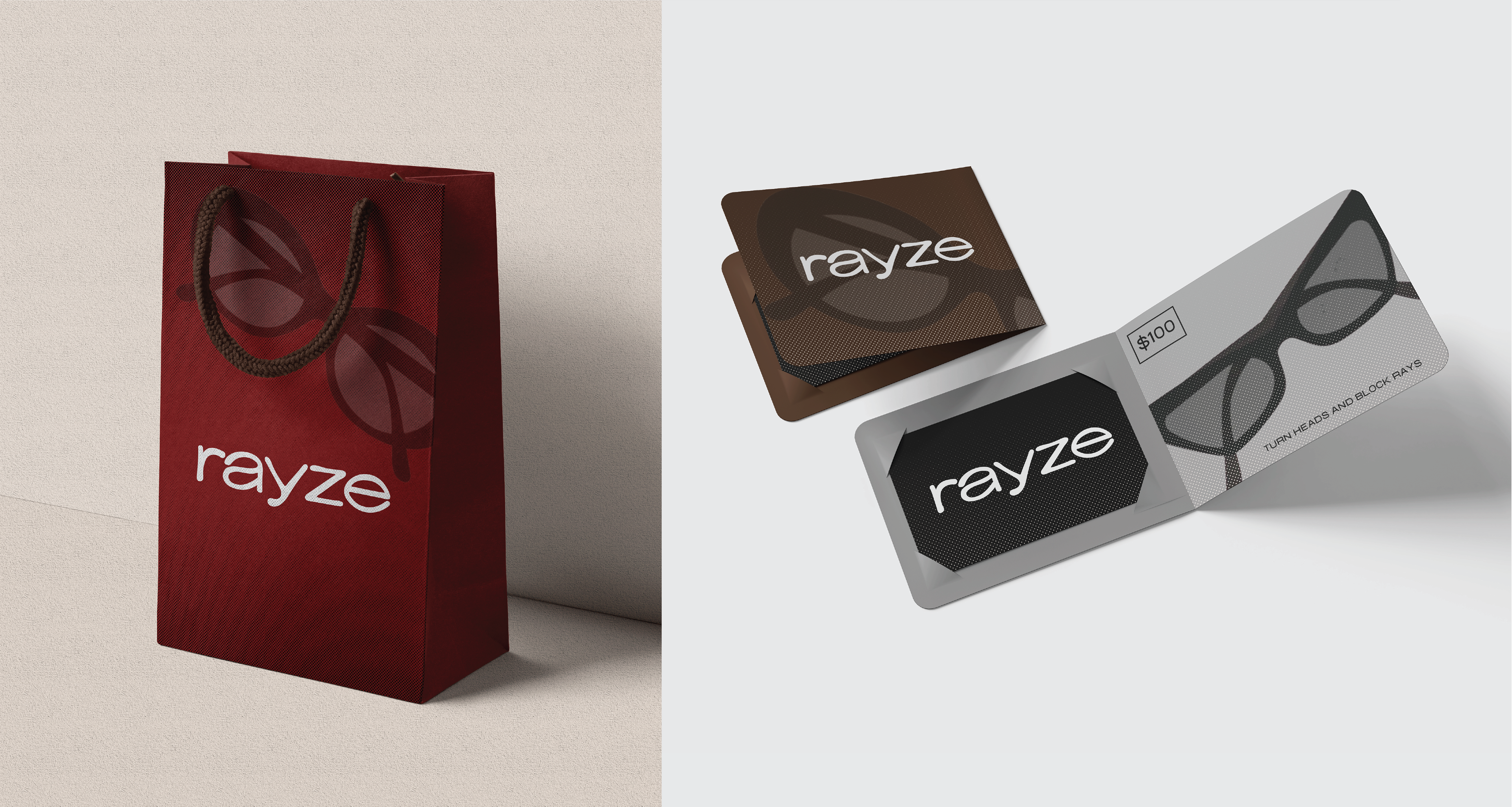 The color palette is built around dark neutrals, steel greys, and warm browns, accented by deep red tones to evoke a sense of vintage sophistication and boldness. These colors reference classic eyewear materials and archival fashion imagery while maintaining a modern, elevated feel. The use of halftone and gradient textures draws from retro print techniques, reinforcing the brand’s nostalgic influence. Paired with clean, minimal graphic elements, these patterns add visual depth while keeping the overall identity refined and intentional.
