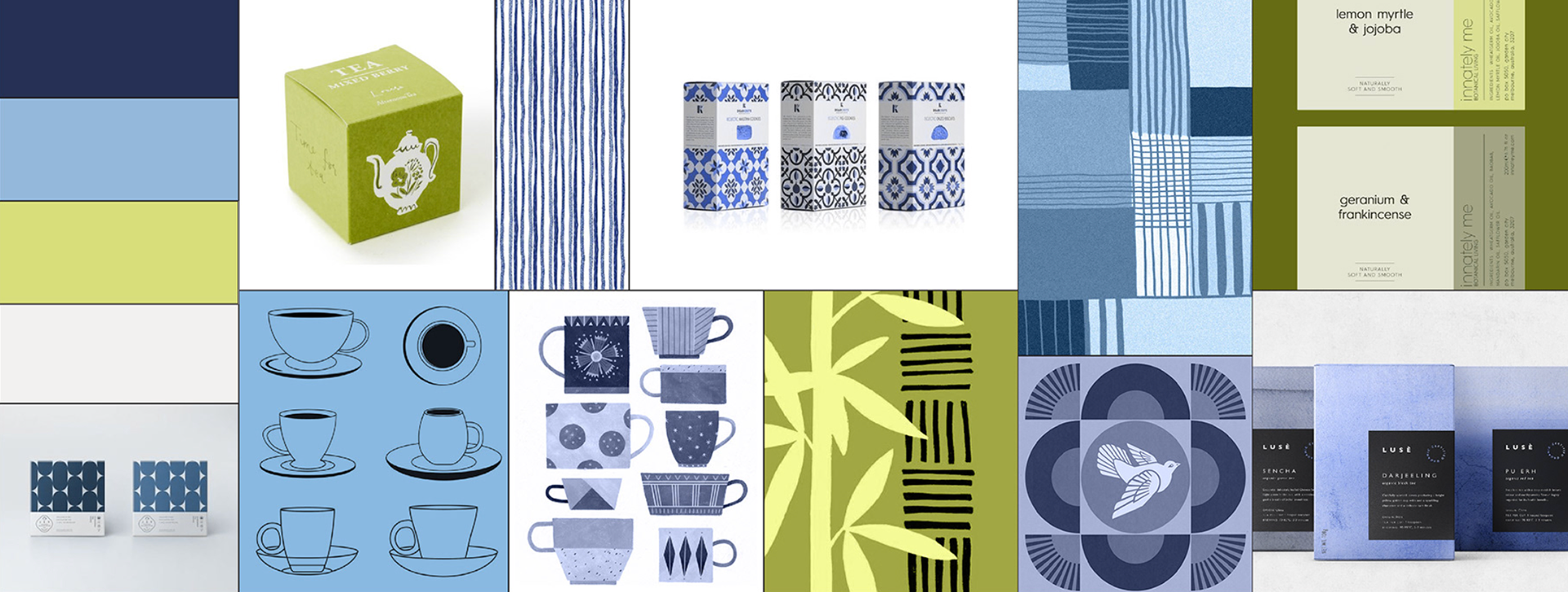 This style board presents my rebranding concept for RISHI Tea & Botanicals, a handcrafted artisanal tea with a modern approach. I intended for the new design to expand on their brand by introducing a color palette of blue, green, and white. Green symbolizing freshness and naturalness, blue conveying tranquility, and white serving as a neutral. The layout balances positive and negative space for a clean, organized look. Illustrated line drawings of teacups quickly identify the product and add ornate brand elements. The typography is simple and sans-serif to maintain readability and modernity without overpowering the logo.