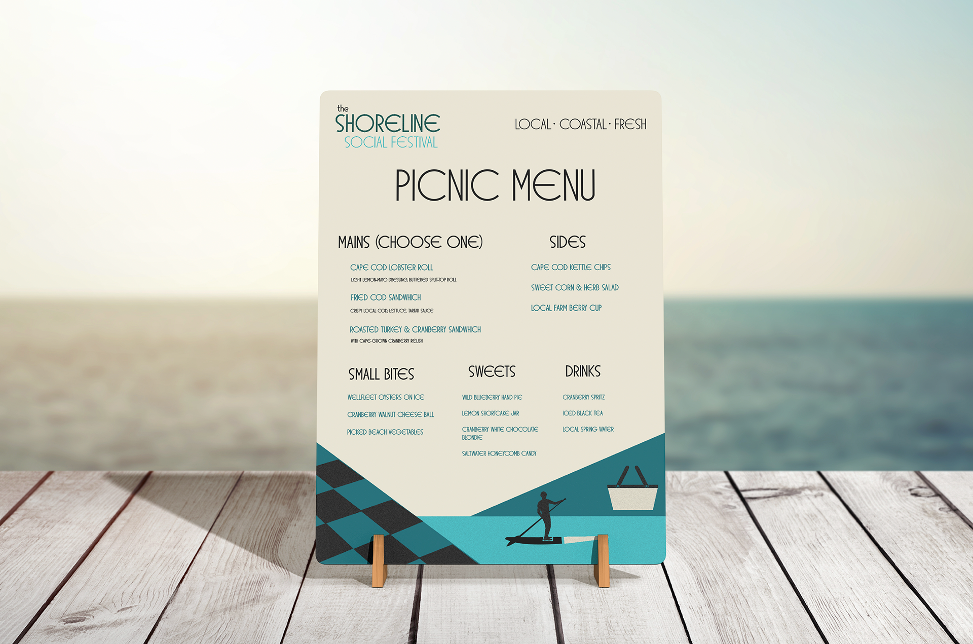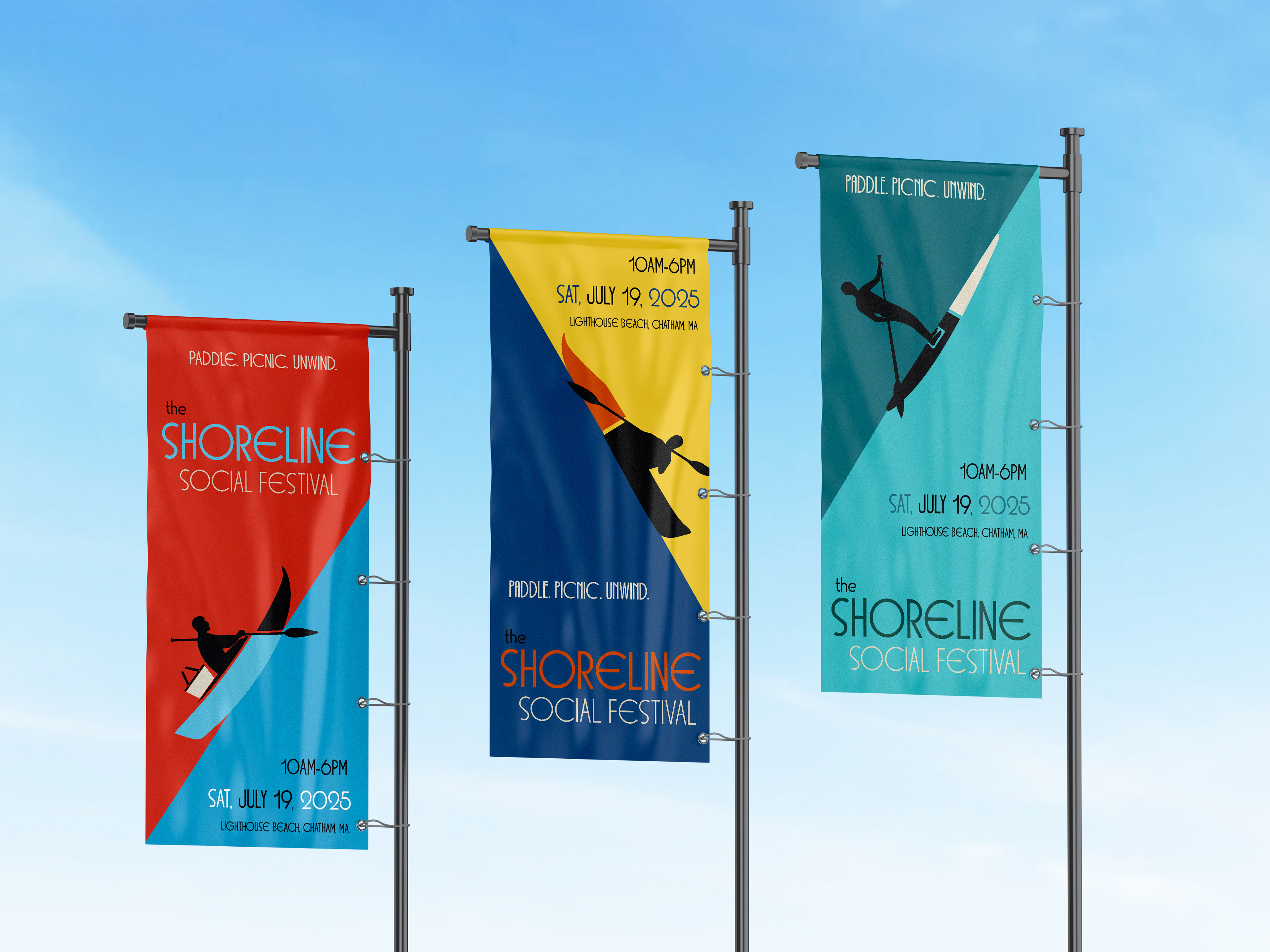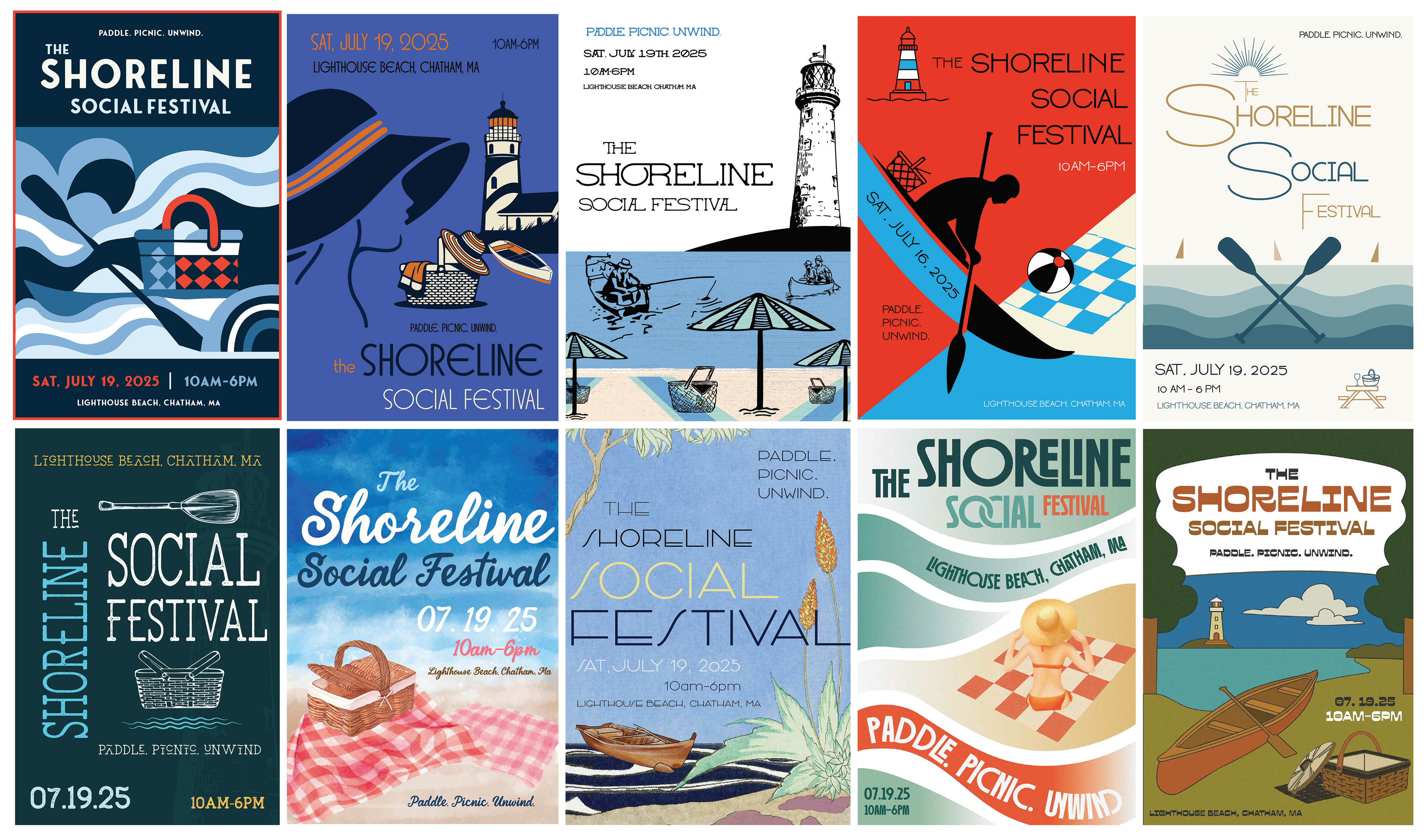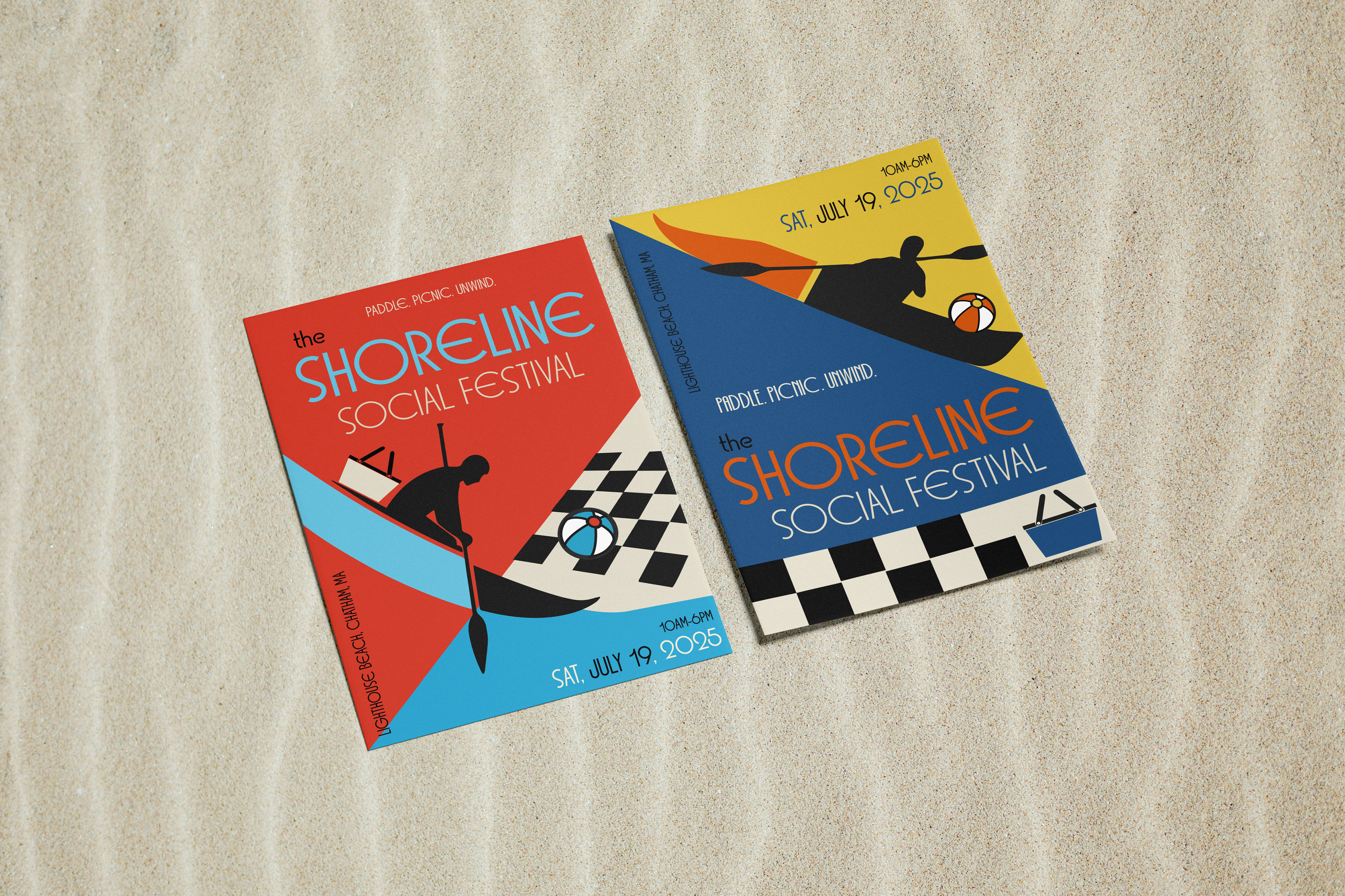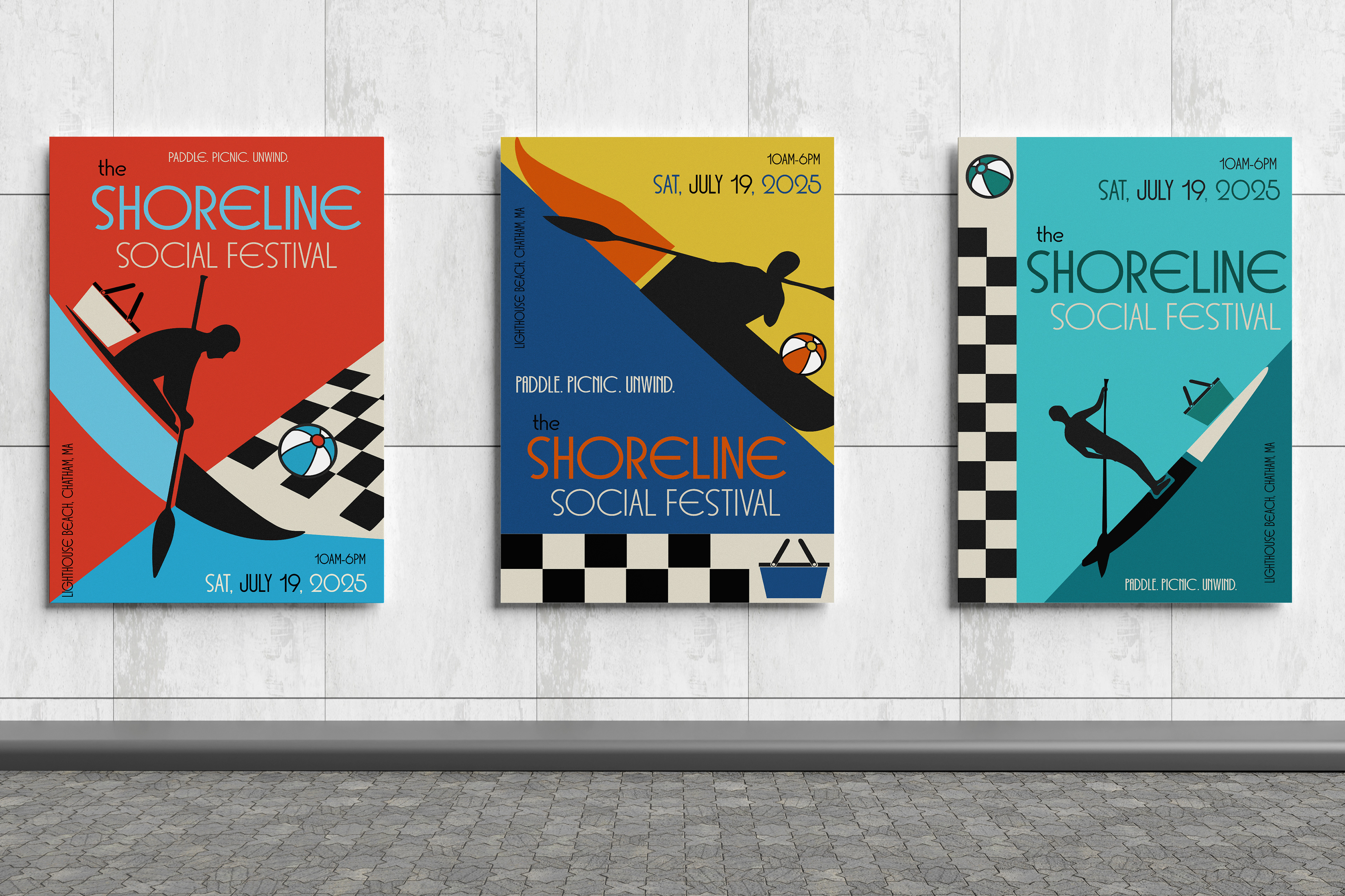 This project explores the development of a cohesive visual identity for The Shoreline Social Festival, a fictional Cape-Cod based festival set along the sands of Lighthouse Beach, MA. The goal was to create a series of poster designs that communicate the festival's relaxed welcoming coastal atmosphere while incorporating the visual language of an Art Deco influenced art movement. Through color, typography, composition, and imagery, the designs highlight the festival's emphasis on slowing down, enjoying simple shoreline pleasures, and celebrating local culture.