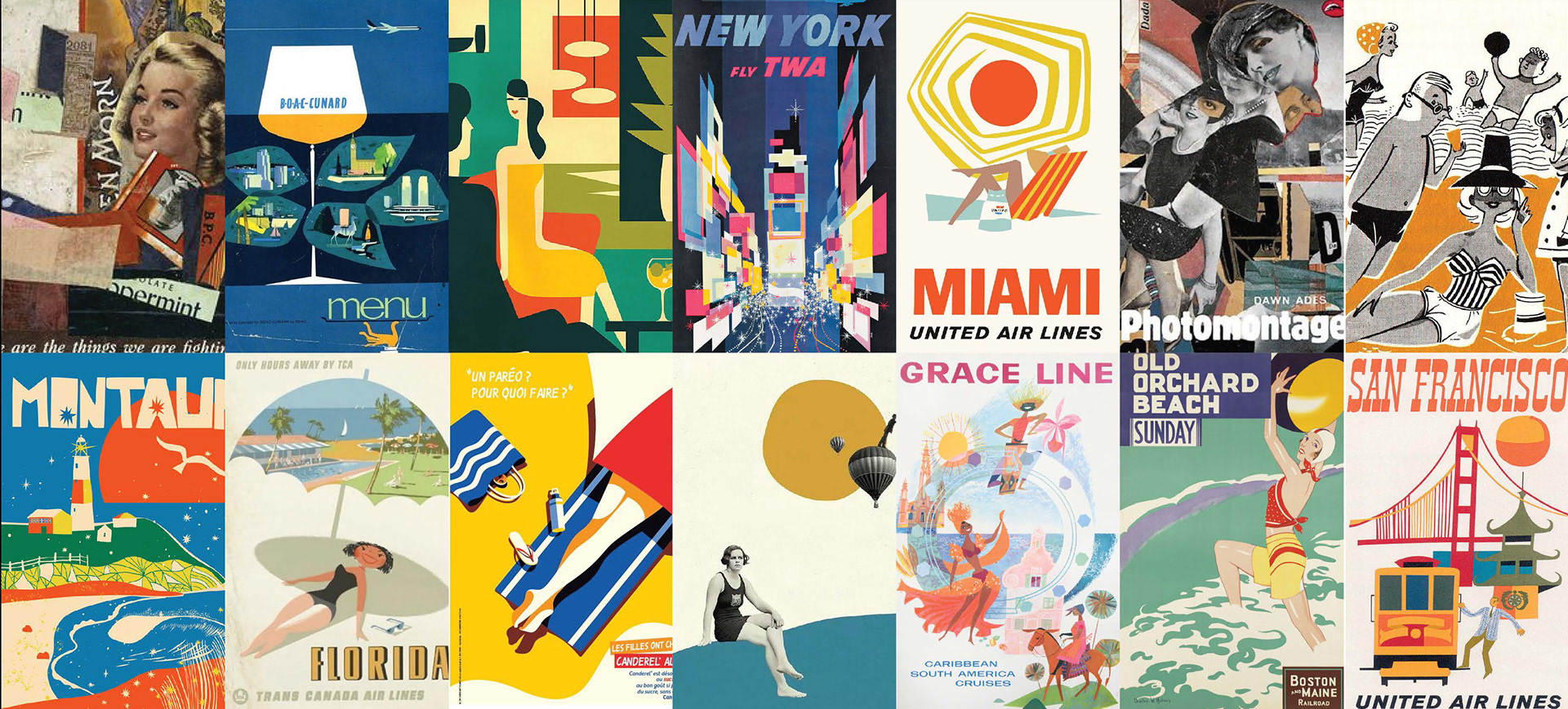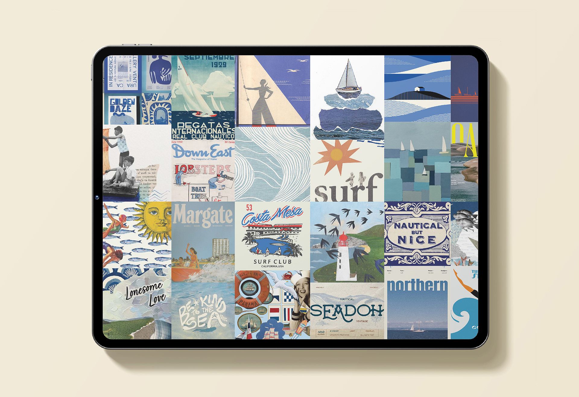 This moodboard pulls together a mix of vintage nautical posters, coastal illustrations, and retro typography to establish the visual tone for the project. It reflects a strong Art Deco and mid-century influence, shown through stylized shapes, clean geometric lines, and muted yet warm color palettes. The imagery highlights classic seaside motifs, including sailboats, waves, lighthouses, swimmers, sunbursts, and shoreline landscapes, capturing a sense of nostalgia tied to coastal travel and leisure. Overall, the moodboard sets a direction that blends seaside nostalgia with a light, airy, and inviting atmosphere, perfectly aligning with the festival's emphasis on relaxation, beach activities, and classic coastal character.